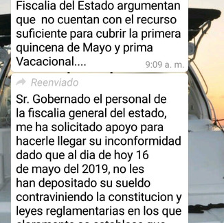 Una vez más, personal de la Fiscalía General de Quintana Roo podría realizar un paro laboral por falta de pago de su nómina, ya que anunciaron entre los mismos compañeros vía WhatsApp, de manifestarse debido a que desde ayer miércoles 15 de mayo, les debieron depositar y hasta hoy 16 no les han cumplido. Dentro de lo escrito en el mensaje y que uno de los trabajadores nos reenvió vía WhatsApp, el cual a la letra dice: “gobernador Carlos Joaquín González, personal de la Fiscalía General del Estado me ha solicitado apoyo para hacerle llegar su inconformidad, dado a que el día de hoy (jueves) 16 de mayo de 2019, no les han depositado su sueldo, contraviniendo la constitución y leyes reglamentarias en la que claramente se establece por el trabajo realizado, se tiene derecho a percibir un sueldo los 15 y 30 de cada mes”. Asimismo, en el mensaje señala el informante, que ya se habló con los directores de áreas y estos manifiestan que no hay recursos para cubrir sus nóminas. Hay que recalcar, la Fiscalía General en Estado, al menos en Cancún, en cuestión de días avanzan de manera rápida en la construcción del nuevo edificio de la misma, en pocas palabras, que si hay recursos para comprar material y cubrir el sueldo de los trabajadores de la obra.