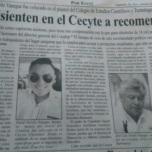 A tres años que lleva gobernando Carlos Joaquín González, los Colegios de Estudios Científicos y Tecnológicos de Quintana Roo se han vuelto parte de la mafia del poder, a raíz que están sirviendo de refugio de personas que apoyaron en su momento, en campaña al ejecutivo. Estos trabajadores, además que no hacen nada, les dieron plazas de jefes sin tener conocimiento de sus labores. De acuerdo a la información que nos proporcionaron docentes de dichos planteles educativos, los cabecillas de esta mafia de poder en los Cecytes son: Javier Castellanos May, director Administrativo de Finanzas con base en la ciudad de Chetumal; Juan José Ortiz Cardín, director general; ambos bajo la complicidad de la dirigente sindical, Cristina Berlanga Manríquez. Los denunciantes recalcaron, que al menos 50 personas tienen identificados a quienes acomodaron en diversos Cecytes. Entre los cargos que les otorgaron, coordinadores de maestros y jefes de mantenimientos (mujeres y hombres), a pesar que desconocen de sus labores, el cual finalmente es otra persona que termina haciendo su trabajo. Asimismo, también acomodaron en el área administrativo donde descaradamente, estas personas se las pasan hablando por teléfono celular parte del día o simplemente desaparecen del plantel. Un ejemplo fue Rolando Alvarado Vázquez, a quien lo nombraron coordinador de docentes en un Cecyte de la ciudad de Chetumal, con un sueldo de 19 mil pesos quincenales, y luego por indicaciones del gobernador, fue candidato a diputado en la campaña pasada por el partido “Confianza por Quintana Roo”. Estos beneficios los obtuvieron los amigos y familiares de Javier Castellanos May, director Administrativo, y Juan José Ortiz, director general, quienes apoyaron en la campaña de Carlos Joaquín González. Los denunciantes, señalaron que estas irregularidades vienen arrastrando desde el año pasado y todavía siguen acomodando personas en los Cecytes, además, en su momento se lo hicieron llegar a la dirigente sindical, Cristina Berlanga Manríquez; sin embargo, ha demostrado que es parte de la corrupción y tráfico de influencias en el gobierno del estado, ya que no mete las manos por sus agremiados, aún cuando hay muchos que tienen años en el sistema y no los han ascendido y con un raquítico sueldo.