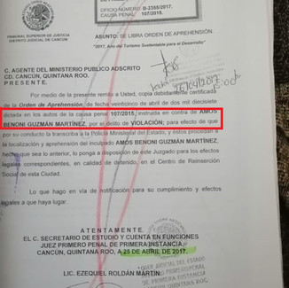 MÁS ERRORES Este “pequeño error” como los jueces llaman a su ineptitud y corrupción en su desempeño, no es la única irregularidad, por mencionar otras más: en el mismo expediente existe un sello de recibido como Subprocuraduría de Justicia en el Estado, con fecha 26 de Abril de 2017; sin embargo, en esa fecha ya era Fiscalía General del Estado de Quintana Roo, o en su caso, Vicefiscalía en la Zona Norte. El 25 de Abril de 2017, es decir, dos días antes de recibido en lo que para el Juzgado todavía era Procuraduría de Justicia en el Estado, se emitió una orden de aprehensión en contra de Amos Benoni Martínez Guzmán, pero dicho documento no contaba con la firma del juez donde tenía conocimiento del mandato que él supuestamente ordenaba. En pocas palabras, era un oficio falso por carecer de firma y en el mismo con sello de recibido como Procuraduría de Justicia en el Estado de Quintana Roo. Lo peor de esta irregularidad, que después de lo manifestado por el papá del imputado, otro juez del mismo Juzgado Penal “A”, ahora con nombre de Ezequiel Roldán Martín, enseguida firmó la orden de aprehensión, pero para entonces había pasado ya más de dos años, y hasta le pusieron una marca con crayón color rojo, para tratar de confundir en la actualización de la firma. Otro de los casos, que el imputado fue enjuiciado como Amos Benoni Guzmán Martínez, incluso así salió la orden de aprehensión, y no con su nombre como debería ser, Amos Benoni Martínez Guzmán. Finalmente, luego que José Isidro Aké, papá de la supuesta víctima quien presentó la denuncia en el 2015, debido a que carecía de pruebas y había manipulación de la misma, quedó archivado en la Fiscalía Especializada en Atención a Delitos Sexuales. Dos años y medio después, esta autoridad la retomó y para eso falsificó la firma del denunciante quien ya no se presentó luego de su denuncia, y de esta manera ampliaron una declaración falsa y con ella solicitó la orden de aprehensión al Juzgado Penal “A”. Esta instancia, de la misma forma y con irregularidades la otorgó en contra de Amos Benoni, aun cuando no coincidía con la firma del denunciante, además, el mandato del juez no tenía firma, tal como se lo mencionamos en la parte de arriba y que es mostrada en este medio de comunicación.