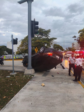 Cancún, Q. Roo, 26 de febrero del 2026.- Recargado sobre un poste de semáforo y volcado con las llantas hacia arriba, terminó un vehículo marca Volkswagen en éste Municipio de Benito Juárez, luego que su conductor se desplazaba a velocidad inmoderada, por lo que acabó hospitalizado.
