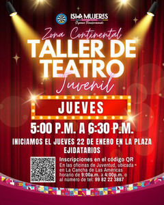 En Isla Mujeres se ofrece el Taller de Teatro Juvenil, el cual se imparte los miércoles y viernes de 19:00 a 20:00 horas, en las oficinas de la Dirección de Juventud ubicadas a un costado del domo de la colonia La Gloria. Asimismo, en la Zona Continental del municipio también se imparte el Taller de Teatro Juvenil, los jueves de 17:00 a 18:30 horas, en la Plaza Ejidatarios.