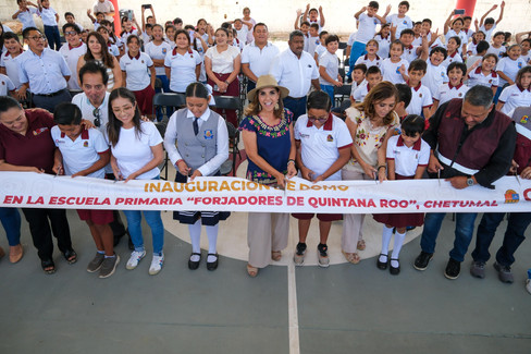 Chetumal, Q. Roo, 16 de junio de 2025.- La gobernadora de Quintana Roo, Mara Lezama Espinosa, entregó hoy lunes el Domo de la escuela primaria “Forjadores de Quintana Roo”, en esta ciudad de Chetumal; una obra que pone fin a casi 40 años de actividades al aire libre sin protección contra sol o lluvia, además, la alegría reflejada en el rostro de 282 niñas y niños reunidos bajo un nuevo y amplio techo.